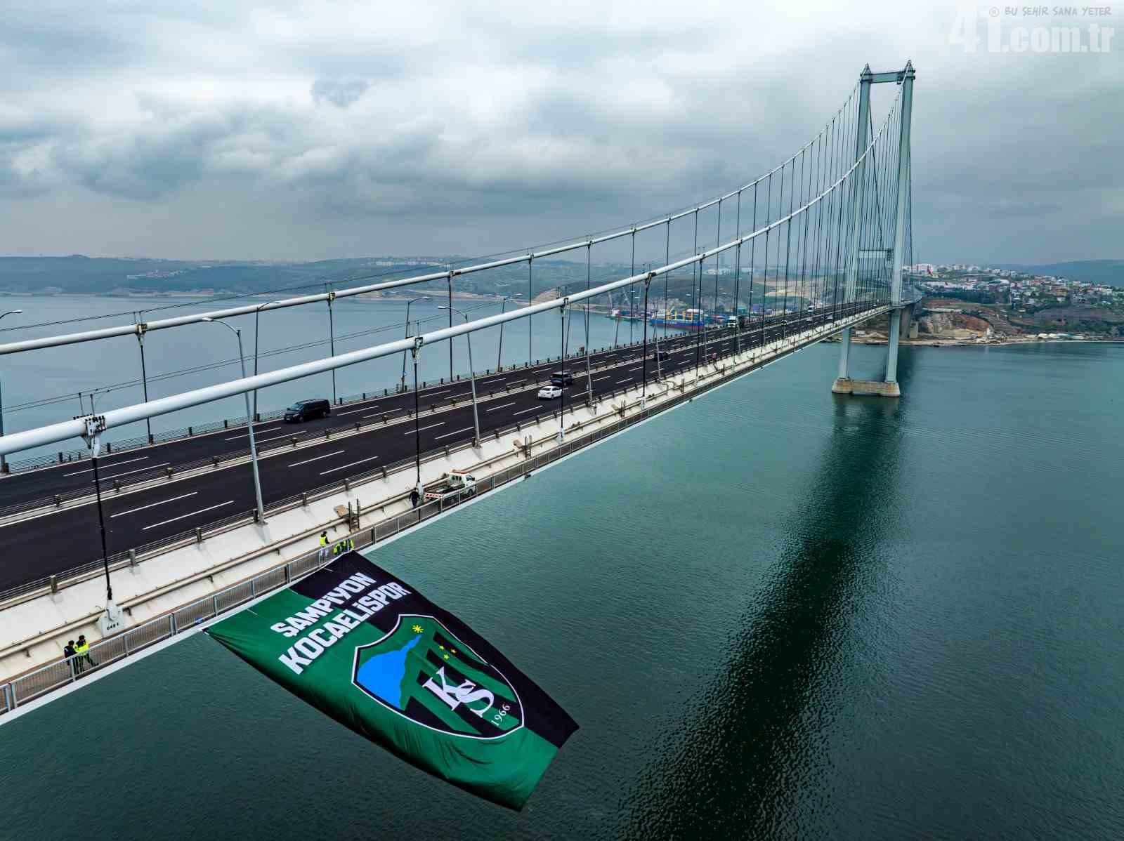 Trenyol 1. Lig’de sezon bitimine 3 hafta kala şampiyonluğunu ilan eden Kocaelispor, 16 yıl aradan sonra Süper Lig’e yükseldi. Binlerce taraftarın iki gün boyunca kutlama yaptığı Kocaeli’de taraftar sosyal medya üzerinden Körfez bayrağının İzmit Körfezi’nde Osmangazi Köprüsü’ne asılmasını istedi. Taraftarın isteğini kırmayan Kocaeli Büyükşehir Belediye Başkanı Tahir Büyükakın, dev Kocaelispor bayrağını Ulaştırma Bakanlığından alınan izinlerin ardından köprüye astırdı. Görüntüleri sosyal medya hesabında paylaşan başkan Büyükakın, “İstediniz yaptık! Osmangazi Köprüsü artık Yeşil-Siyah” dedi.