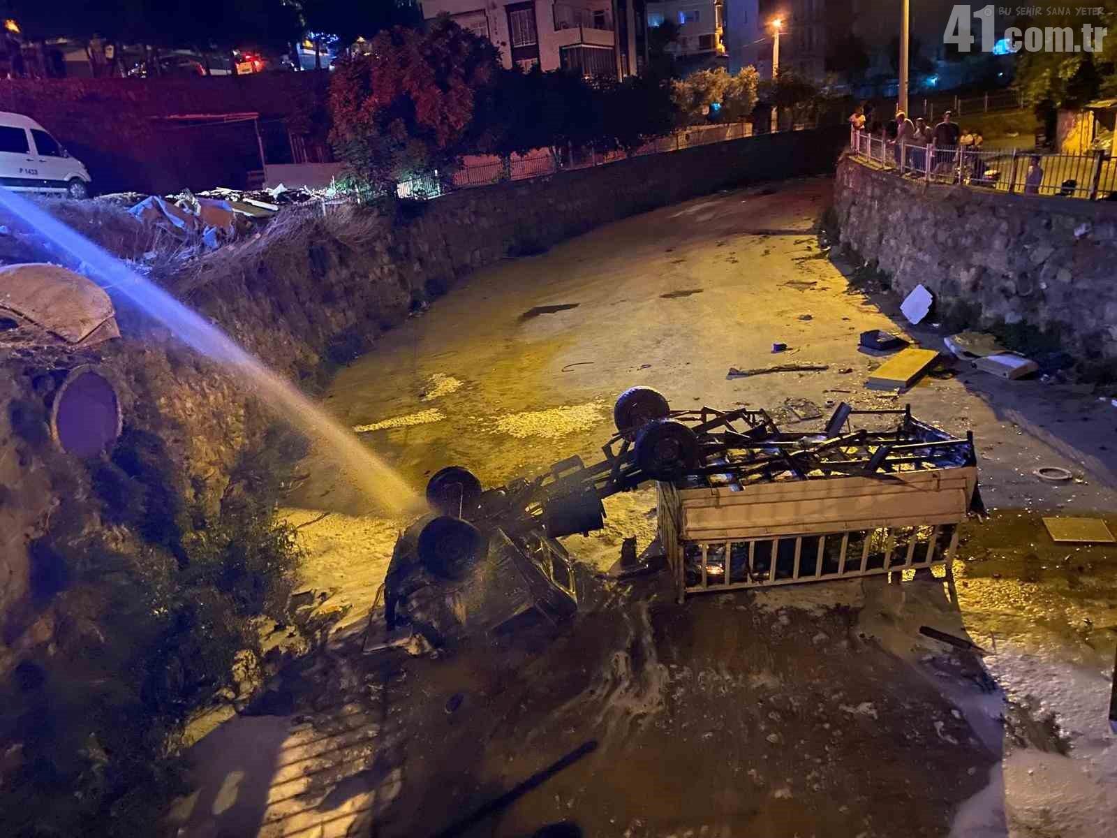 Kocaeli’nin Körfez ilçesinde park halindeyken freni boşalan kamyonet, dere yatağına düşerek alev aldı.