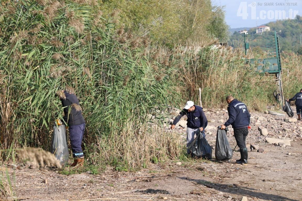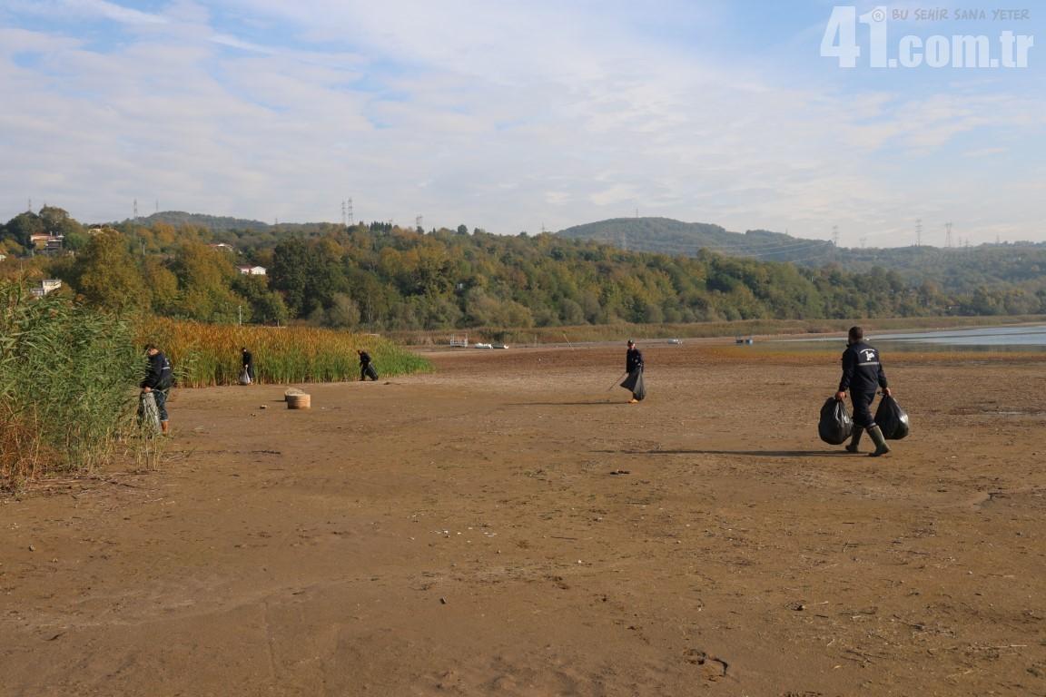Kartepe’de bulunan Eşme Sahili’nde Sapanca Gölü’nün su seviyesinin düşmesiyle ortaya çıkan atıklar temizlendi.