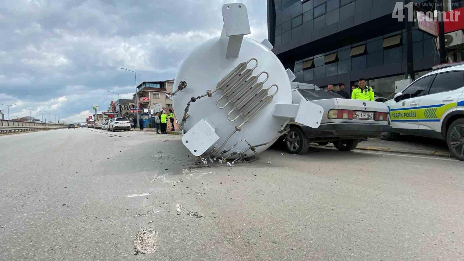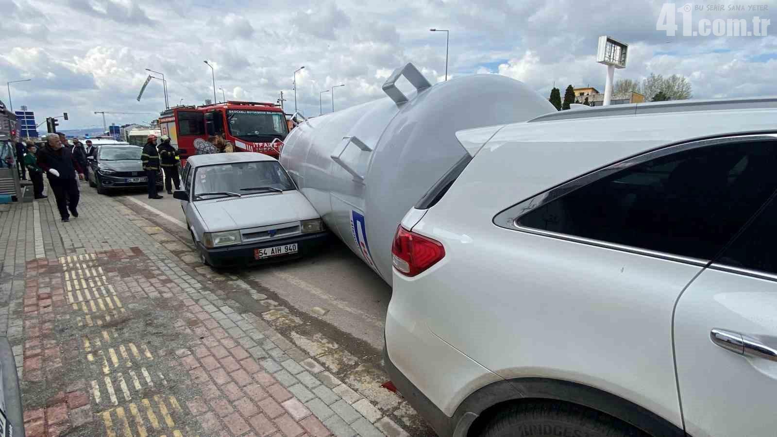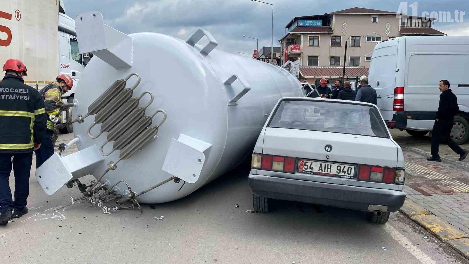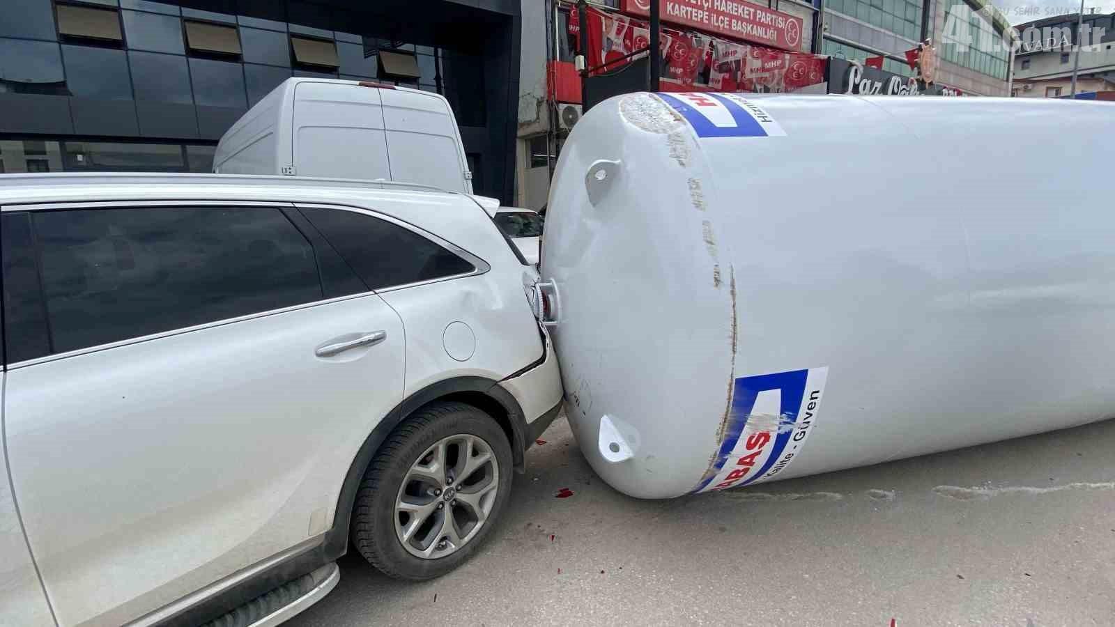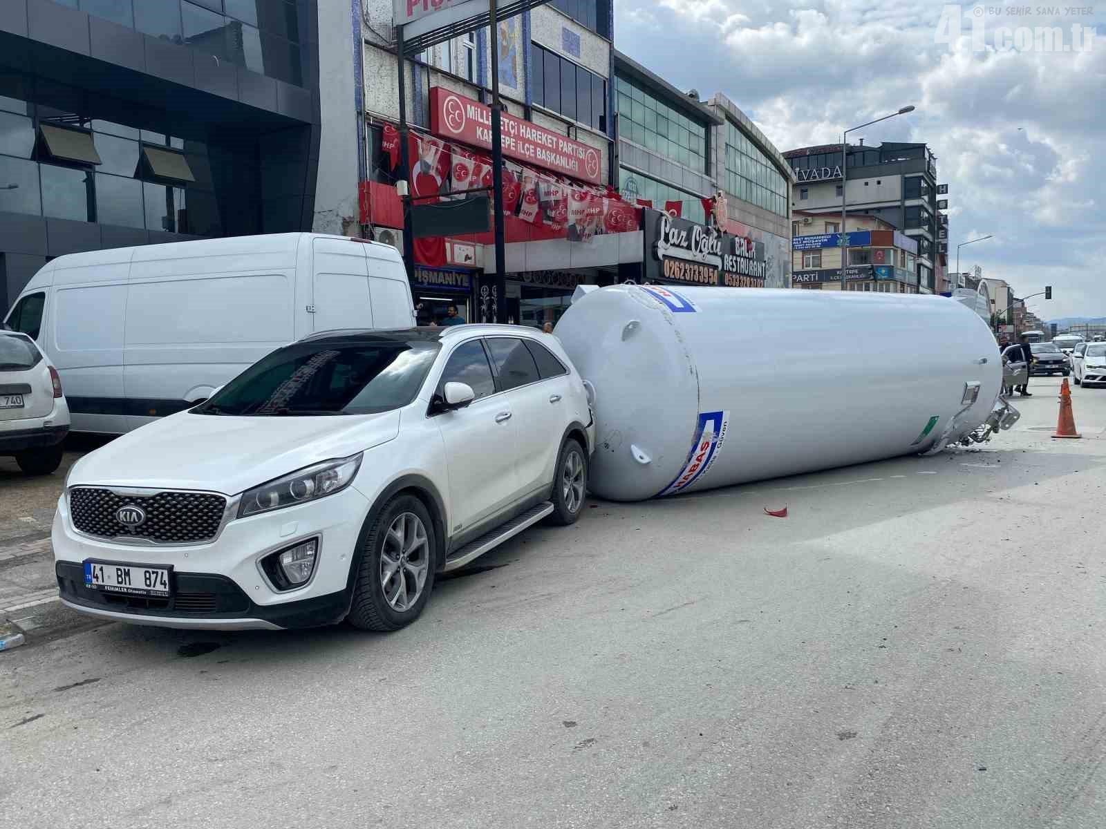 Kocaeli’nin Kartepe ilçesinde tırın dorsesinde taşınan boş gaz tankeri, yola devrilerek park halindeki iki otomobile çarptı. Yapılan incelemelerde tır sürücüsünün ehliyetinin olmadığı ortaya çıktı.