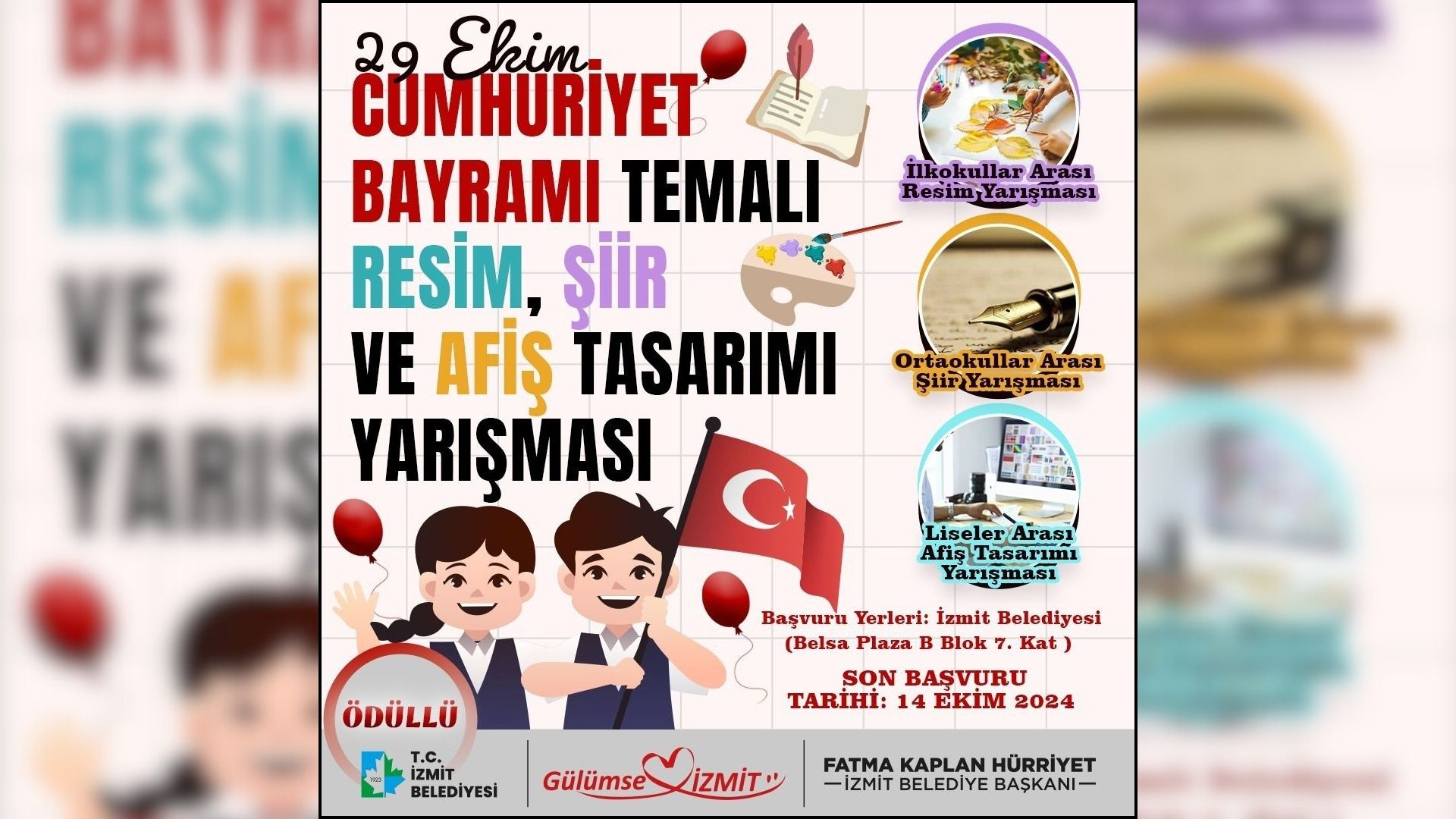 İzmit Belediyesi Kadın ve Aile Hizmetleri Müdürlüğü, 29 Ekim Cumhuriyet Bayramı kapsamında ilkokul, ortaokul ve lise öğrencilerine yönelik ödüllü yarışmalar düzenliyor. Yarışmalar, genç nesillerin Cumhuriyet’in değerlerine olan bağlılıklarını pekiştirmek ve sanatsal yeteneklerini sergilemeleri için önemli bir fırsat sunuyor.