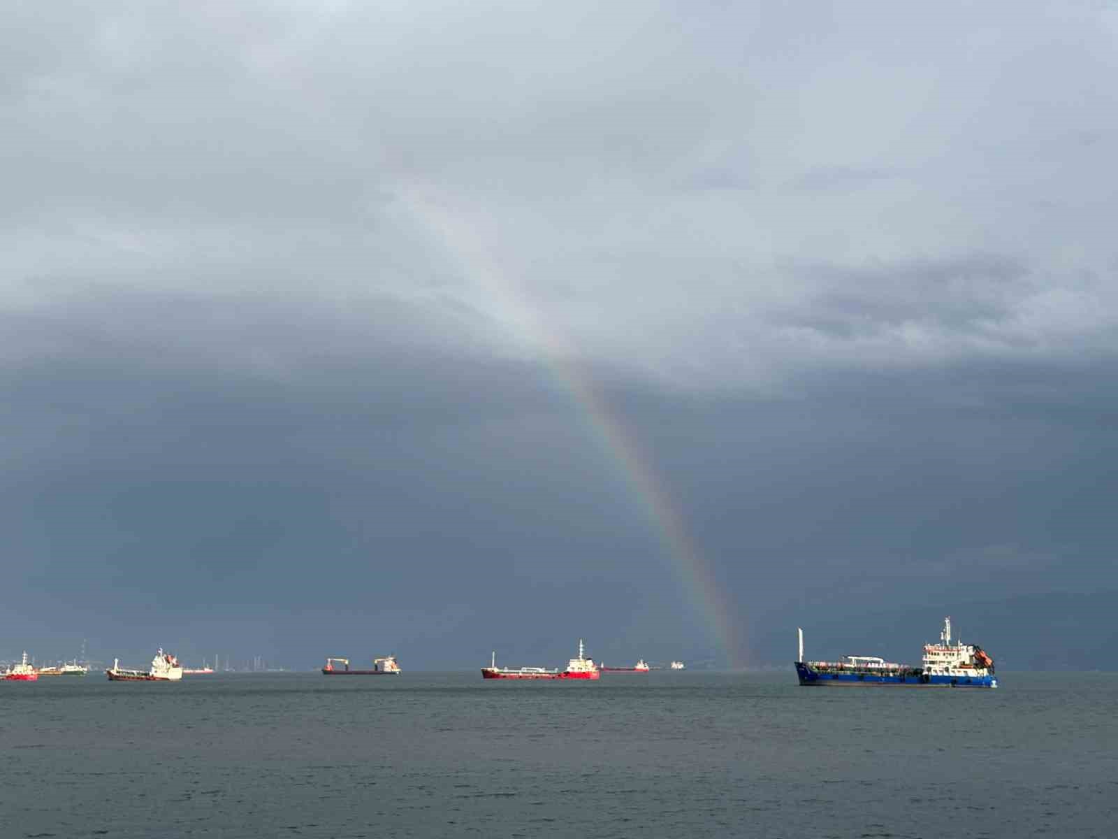 Kocaeli’de yağmurun ardından gökkuşağı belirdi. Körfez’de seyreden gemilerle birlikte ortaya çıkan manzara, görsel bir şölen sundu.