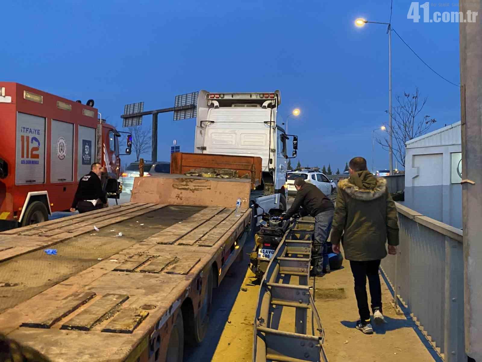 Kocaeli D-130 Karayolu’nda seyir halinde olan motosiklet, tırla bariyer arasına sıkıştı. İtfaiye ekipleri tarafından çıkarılan sıkıştıkları yerden çıkarılan 2 yaralı hastaneye kaldırıldı.