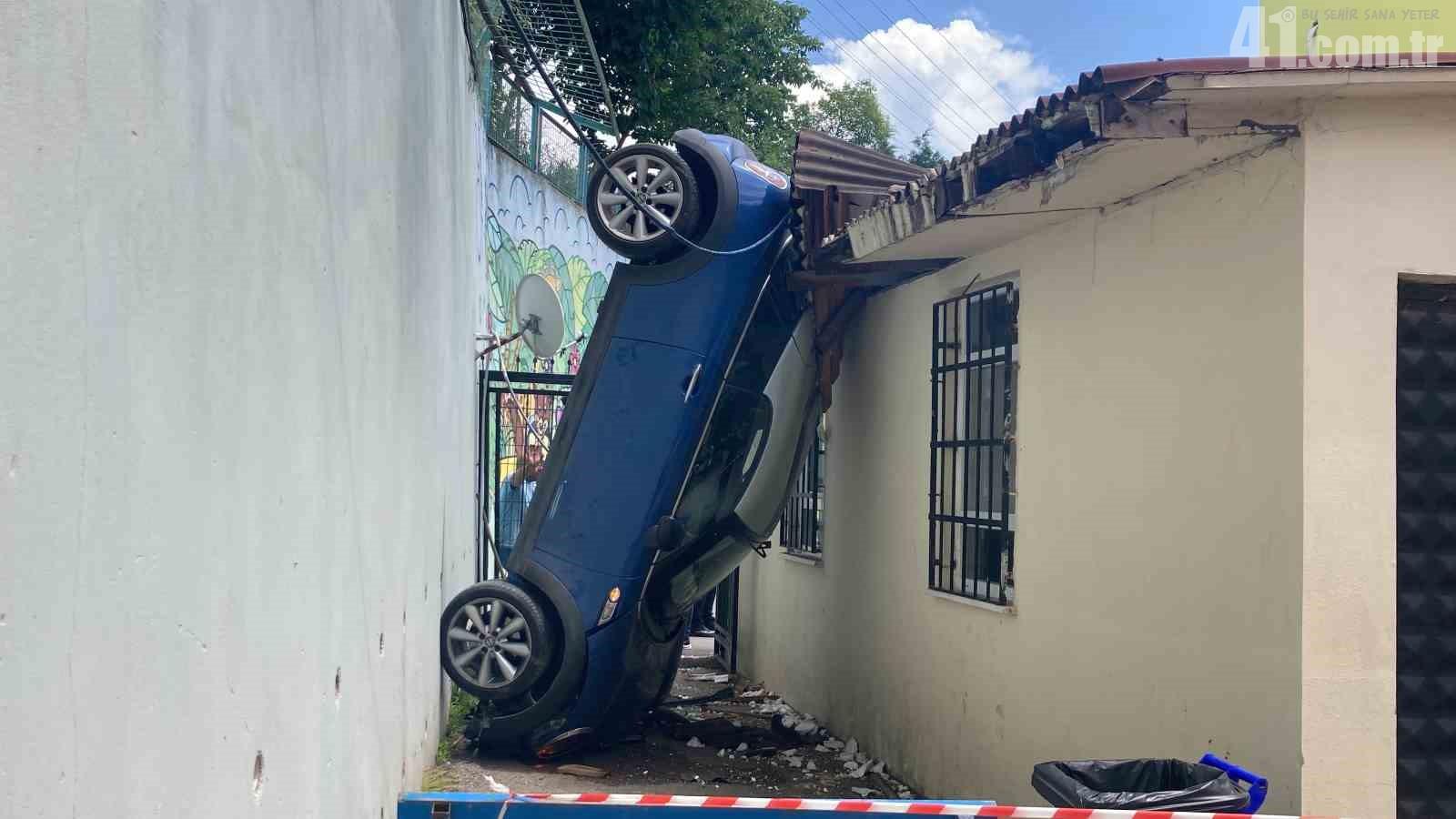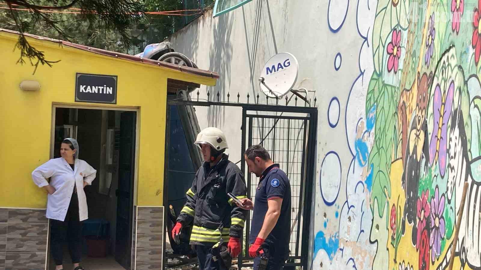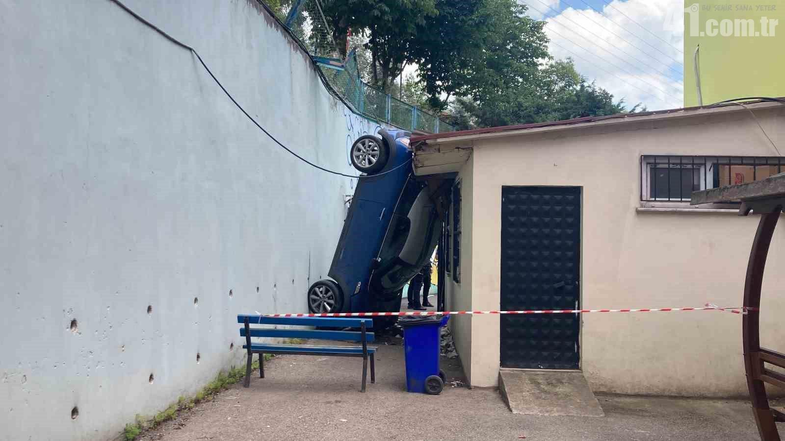 Kocaeli’de kontrolden çıkan otomobil, 5 metrelik istinat duvarını aşarak okul bahçesine uçtu. Otomobil, kantin ve istinat duvarı arasında dik kalırken, sürücü yaralandı. Öğrencilerin derste olması faciayı önledi.