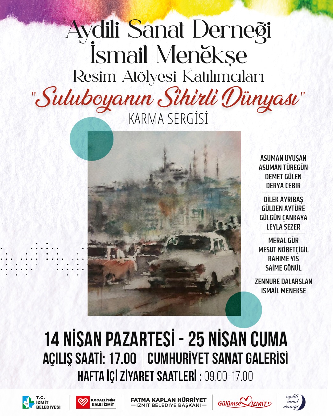İzmit Belediyesi, kente sanatı taşıyan etkinliklerine bir yenisi daha ekliyor. Aydili Sanat Derneği bünyesinde faaliyet gösteren İsmail Menekşe Resim Atölyesi katılımcılarının eserlerinden oluşan “Suluboyanın Sihirli Dünyası” adlı karma sergi, 14 Nisan Pazartesi günü saat 17.00’de Cumhuriyet Sanat Galerisi’nde sanatseverlerle buluşacak.