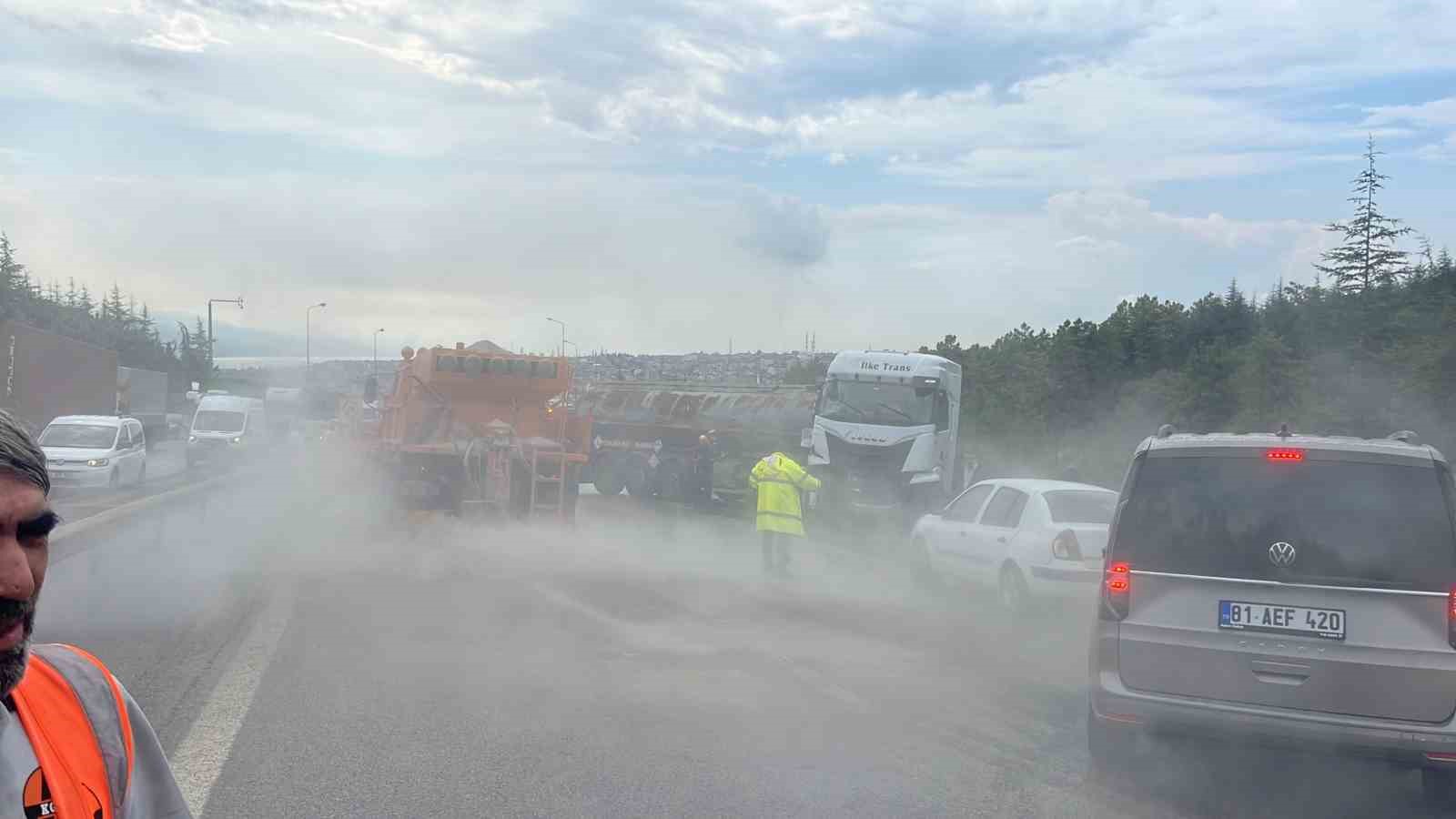 Kaza 14.00 sıralarında Kuruçeşme geçişinde meydana geldi. İstanbul yönüne giden 3 tanker, 2 tır ve 1 otomobil, yağmur sebebiyle kayganlaşan yolda zincirleme kazaya karıştı. LPG yüklü tanker, bariyerleri aşarak, ağaçlık alana uçtu. Olay yerine çok sayıda sağlık, itfaiye ve polis ekipleri sevk edildi. Kazada ilk belirlemelere göre, 4 kişi yaralandı. Yaralılar, sağlık ekiplerinin müdahalesinin ardından hastaneye kaldırıldı. Kaza sebebiyle İstanbul istikameti trafiğe kapanırken, uzun araç kuyrukları oluştu. Ekipler, LPG yüklü tankerin patlama ihtimaline karşı önlem aldı. Yola dökülen kaygan madde itfaiye ekipleri tarafından temizlendi. Yolun açılması için çalışmalar sürüyor.