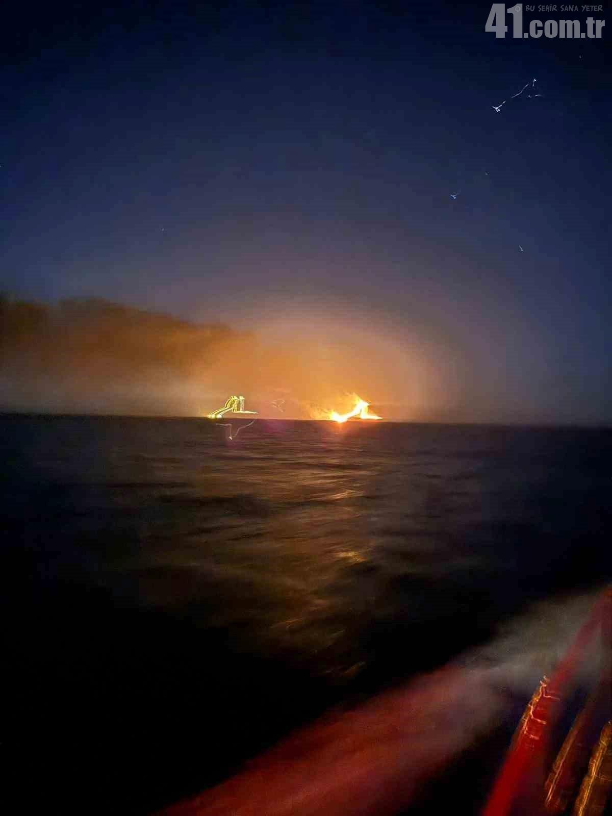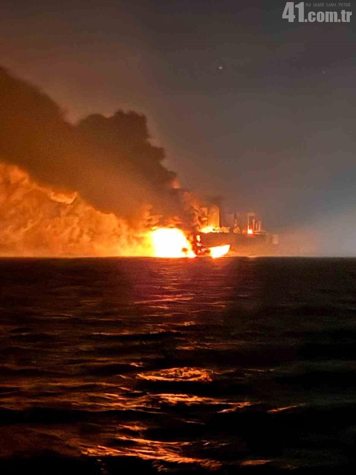 Kocaeli’nin Kandıra ilçesi Kefken açıklarında yangın çıkan yabancı menşeli gemideki 25 kişi tahliye edilirken, yanan geminin görüntülerine ulaşıldı.